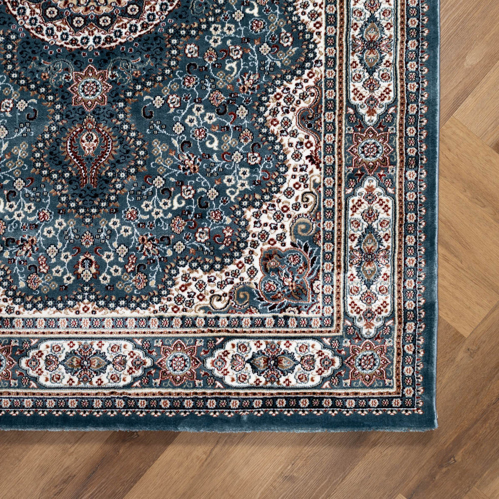שטיח בעיצוב פרסי מסורתי בגווני כחול עמוק, שנהב ובורדו - עם נוכחות עשירה וקלאסית שמכניסה לבית תחושת יוקרה ורוגע. הדוגמה המרכזית מעוטרת בעבודת פרטים מרהיבה שמזמינה מבט נוסף.