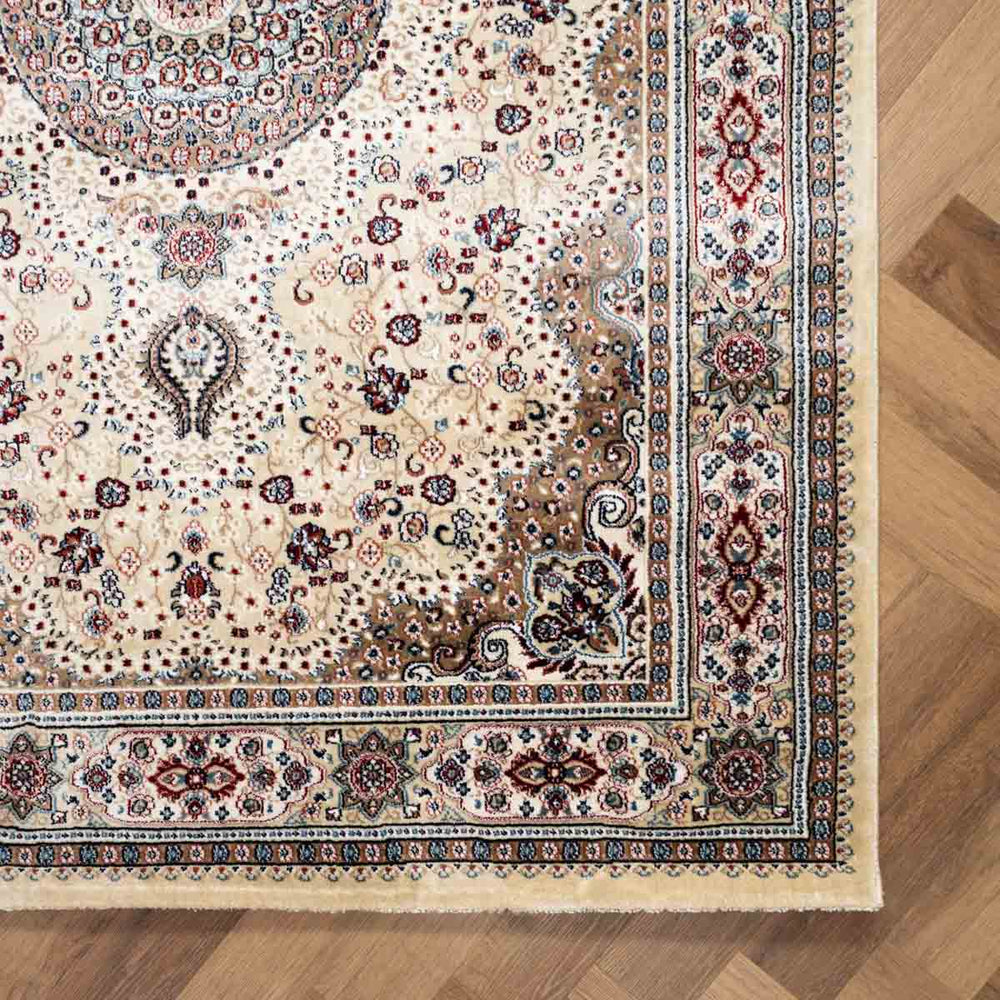שטיח קלאסי בגווני בז' שמנת עם חום עמוק ונגיעות בורדו – משרה חמימות ואלגנטיות רכה בכל חלל.