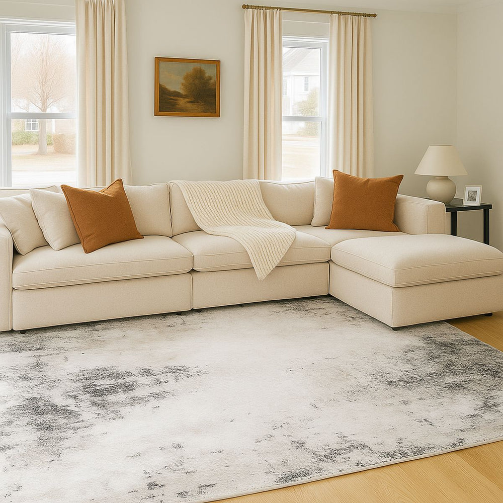 שטיח מודרני בגווני אפור, לבן ושחור – עם טקסטורה מופשטת שיוצרת מראה ייחודי ומעוצב.