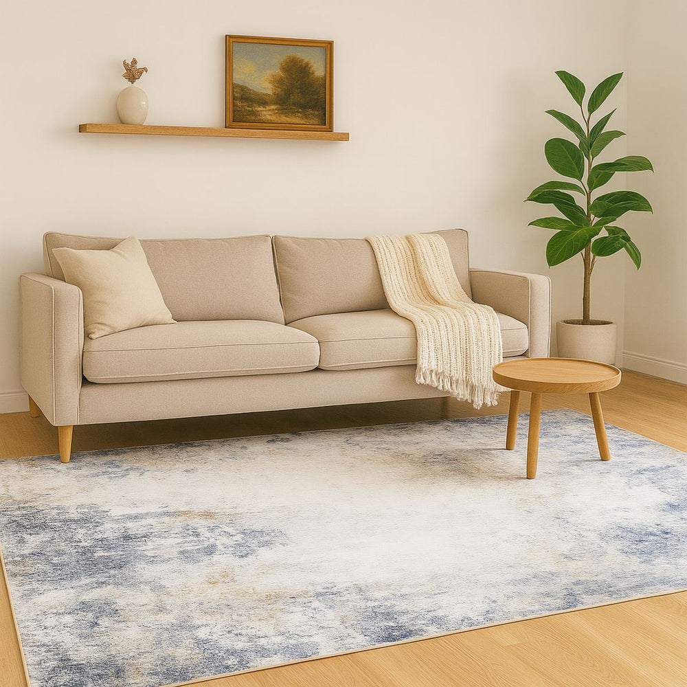 שטיח יוקרתי בעיצוב אבסטרקטי-וינטאז' עם שילוב צבעים של אפור, כחול וזהב דהוי. הטקסטורה והדוגמה יוצרים תחושה אלגנטית, חמימה ומזמינה – כזו שמשתלבת בהרמוניה בכל חלל.