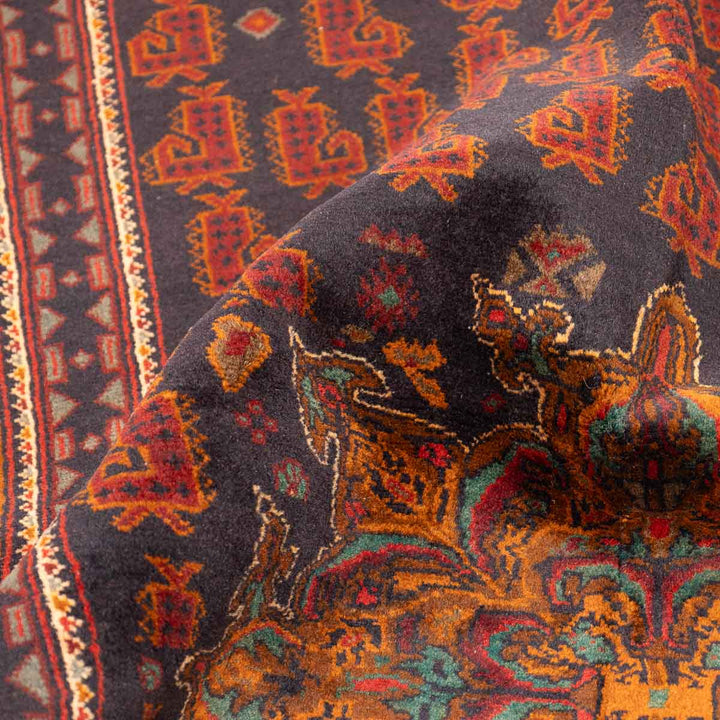 עיצוב בלוץ' קלאסי – דגם מרכזי פרחוני מוקף גבולות מעוטרים ודוגמאות גאומטריות שמזוהות עם אזור מזרח איראן.