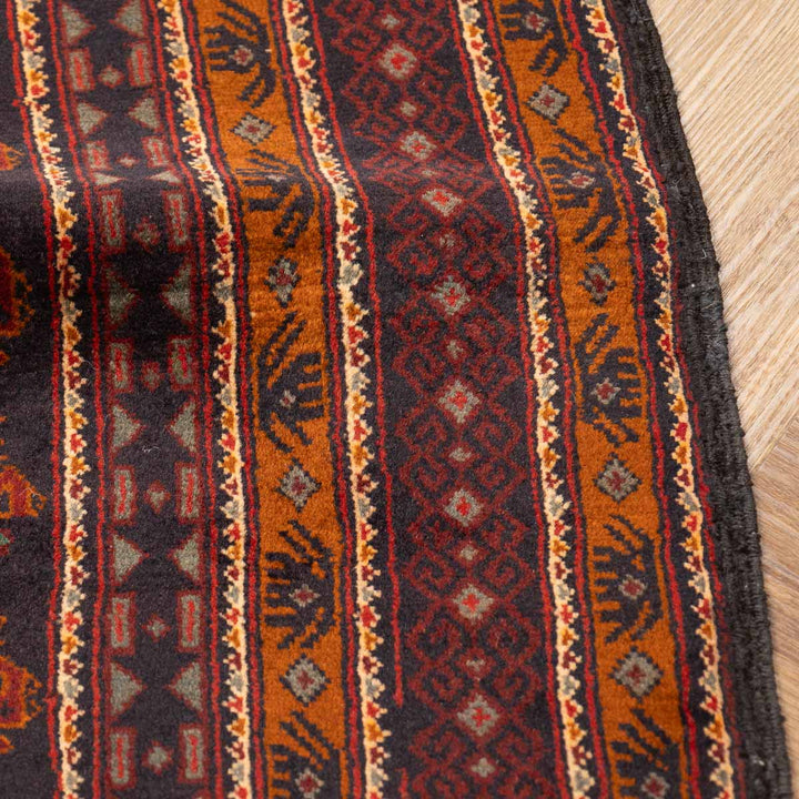 שטיח בעבודת יד בסגנון בלוץ' מסורתי, שמגיע אלינו מהמזרח של איראן. צבעים עמוקים של אדום, בורדו ושחור יוצרים מראה דרמטי ונועז, עם דוגמה שבטית עשירה ופרטים גיאומטריים מסורתיים.