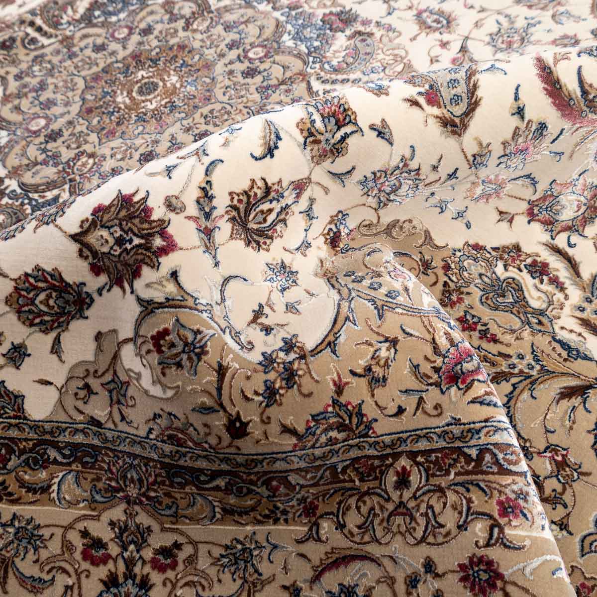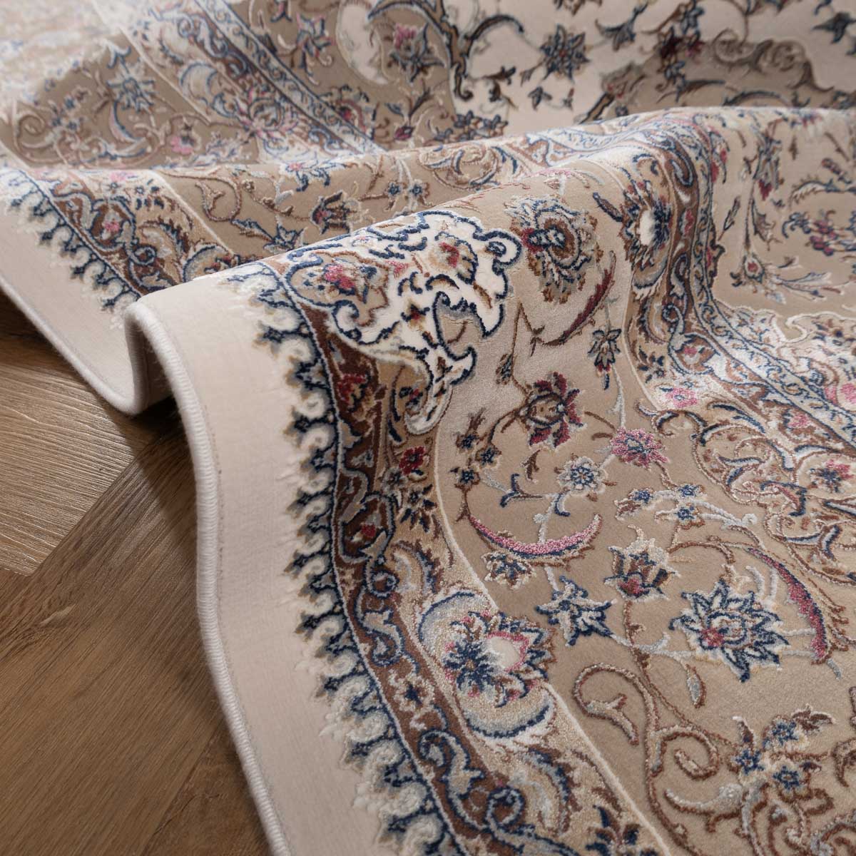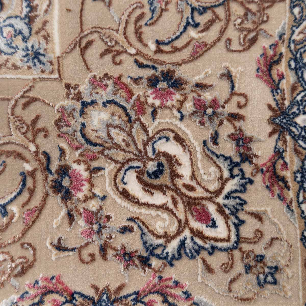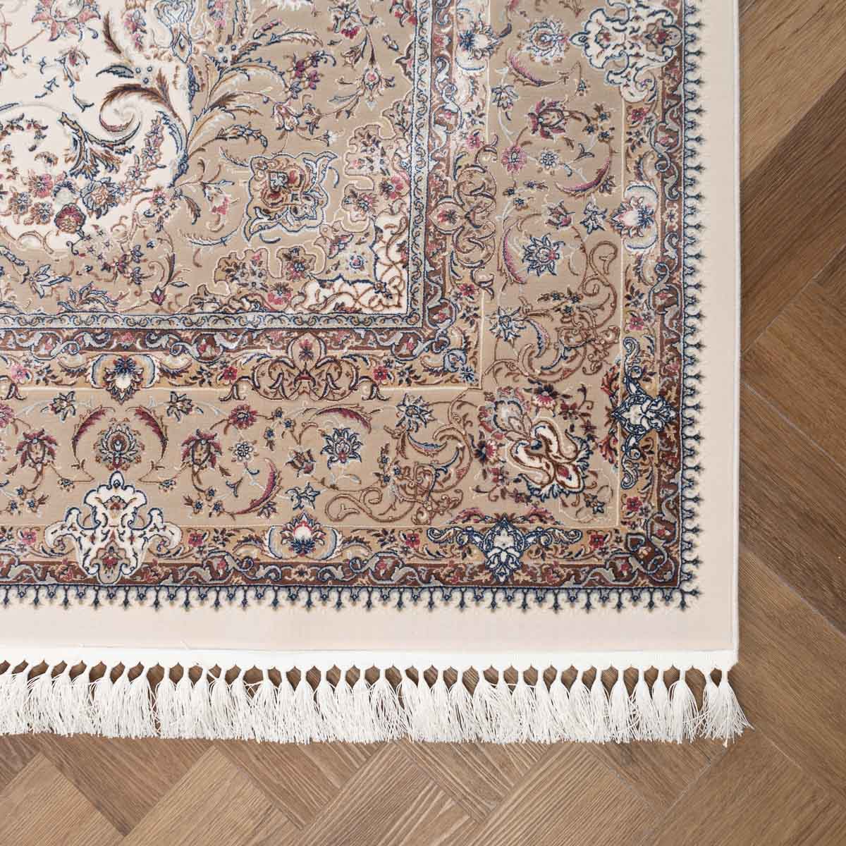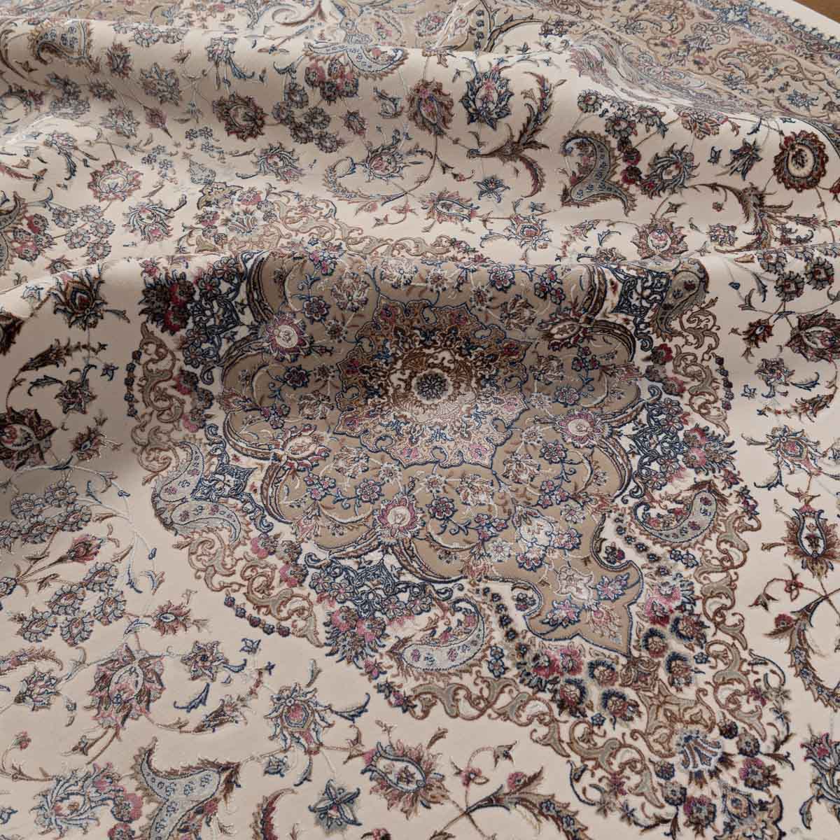 דוגמה פרסית עשירה עם מדליון מרכזי ופרטים אורנמנטליים צפופים, בפריסה סימטרית ומאוזנת. שילוב גווני בז', שמנת, חום עדין ונגיעות כחול ואדמדם יוצר מראה קלאסי, עמוק ועל זמני. מתאים לסלון מרכזי, פינת אוכל רשמית או חלל שמחפש נוכחות יוקרתית ושקטה.