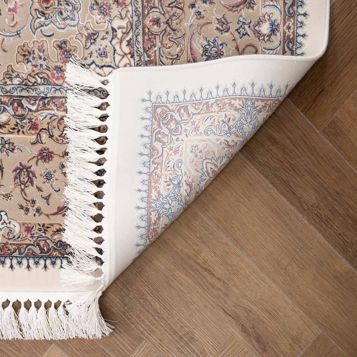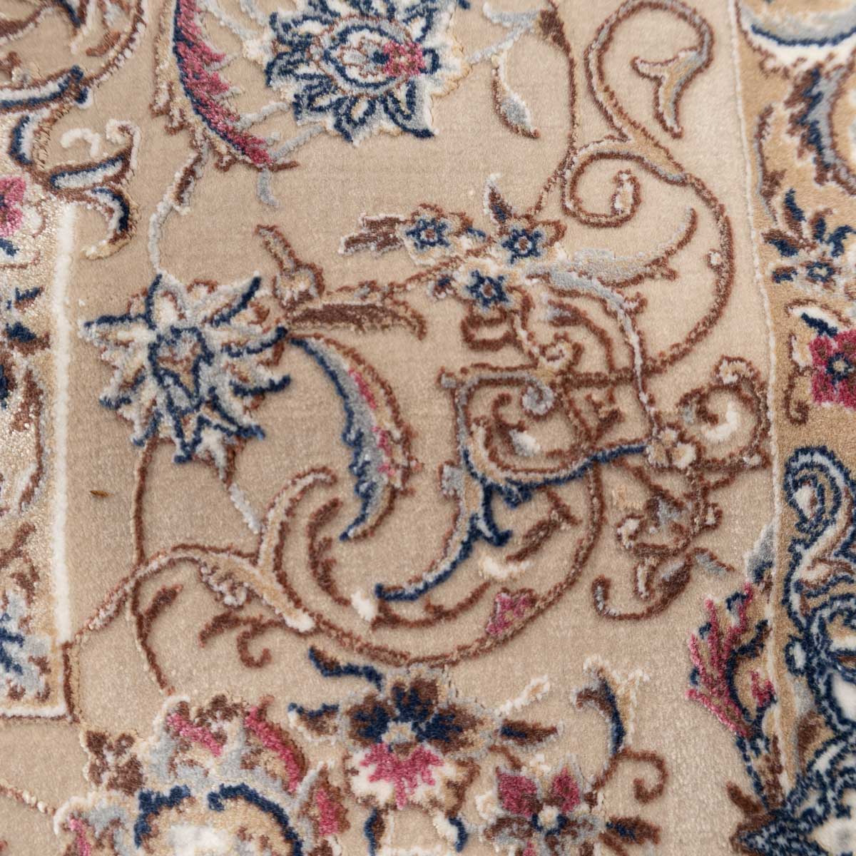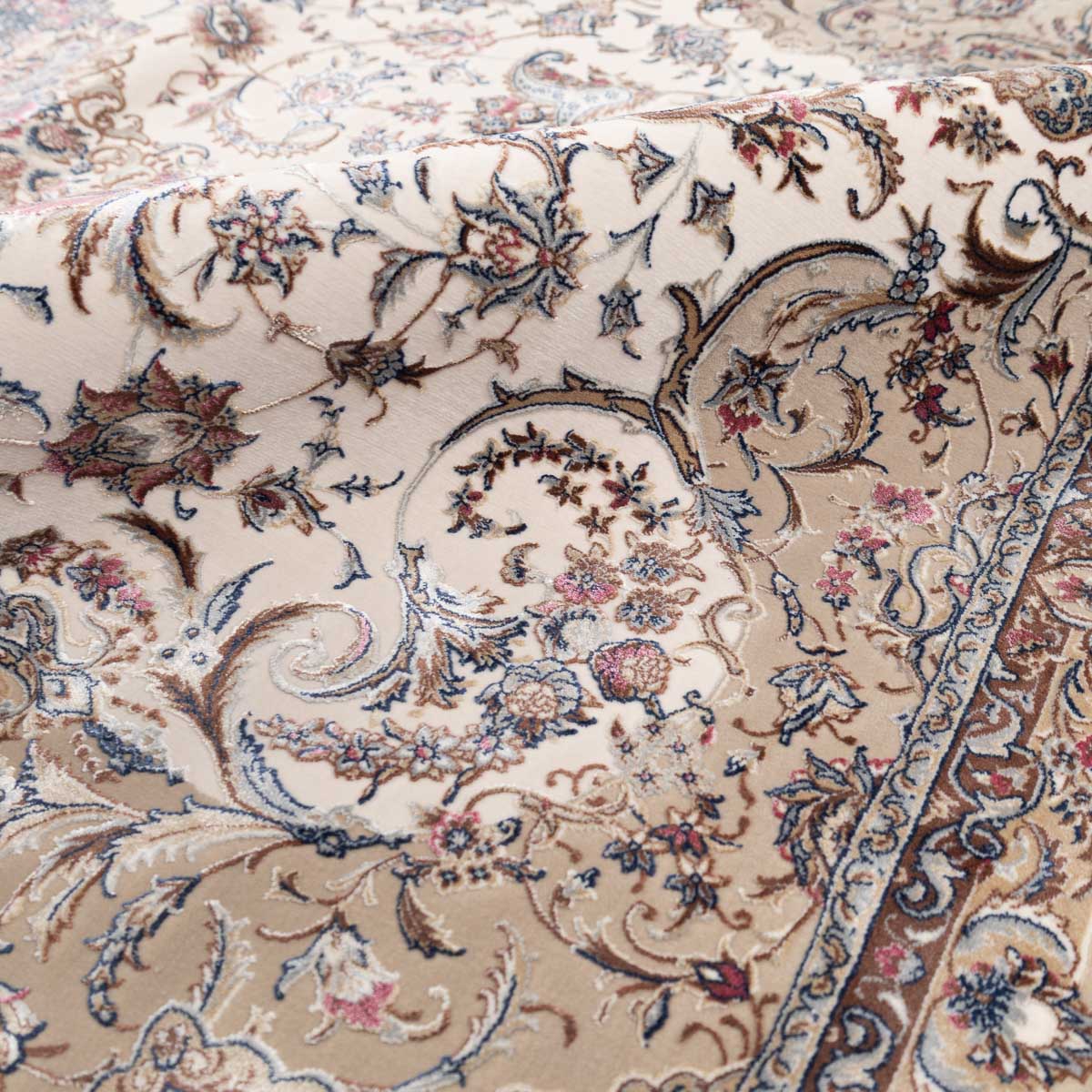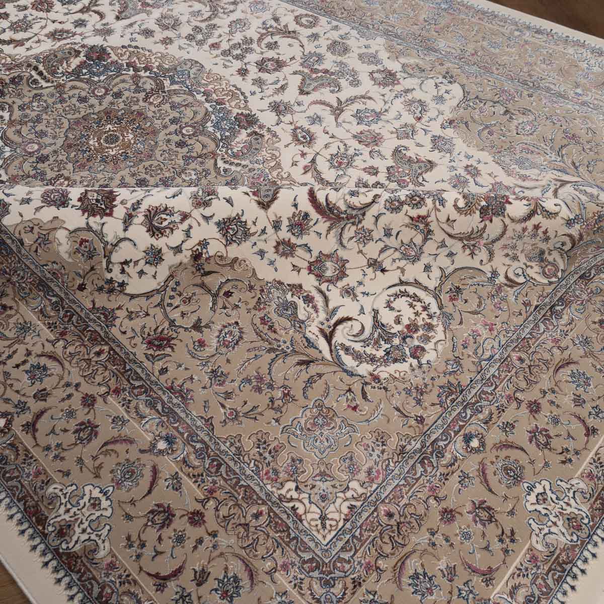 דוגמה פרסית עשירה עם מדליון מרכזי ופרטים אורנמנטליים צפופים, בפריסה סימטרית ומאוזנת. שילוב גווני בז', שמנת, חום עדין ונגיעות כחול ואדמדם יוצר מראה קלאסי, עמוק ועל זמני. מתאים לסלון מרכזי, פינת אוכל רשמית או חלל שמחפש נוכחות יוקרתית ושקטה.