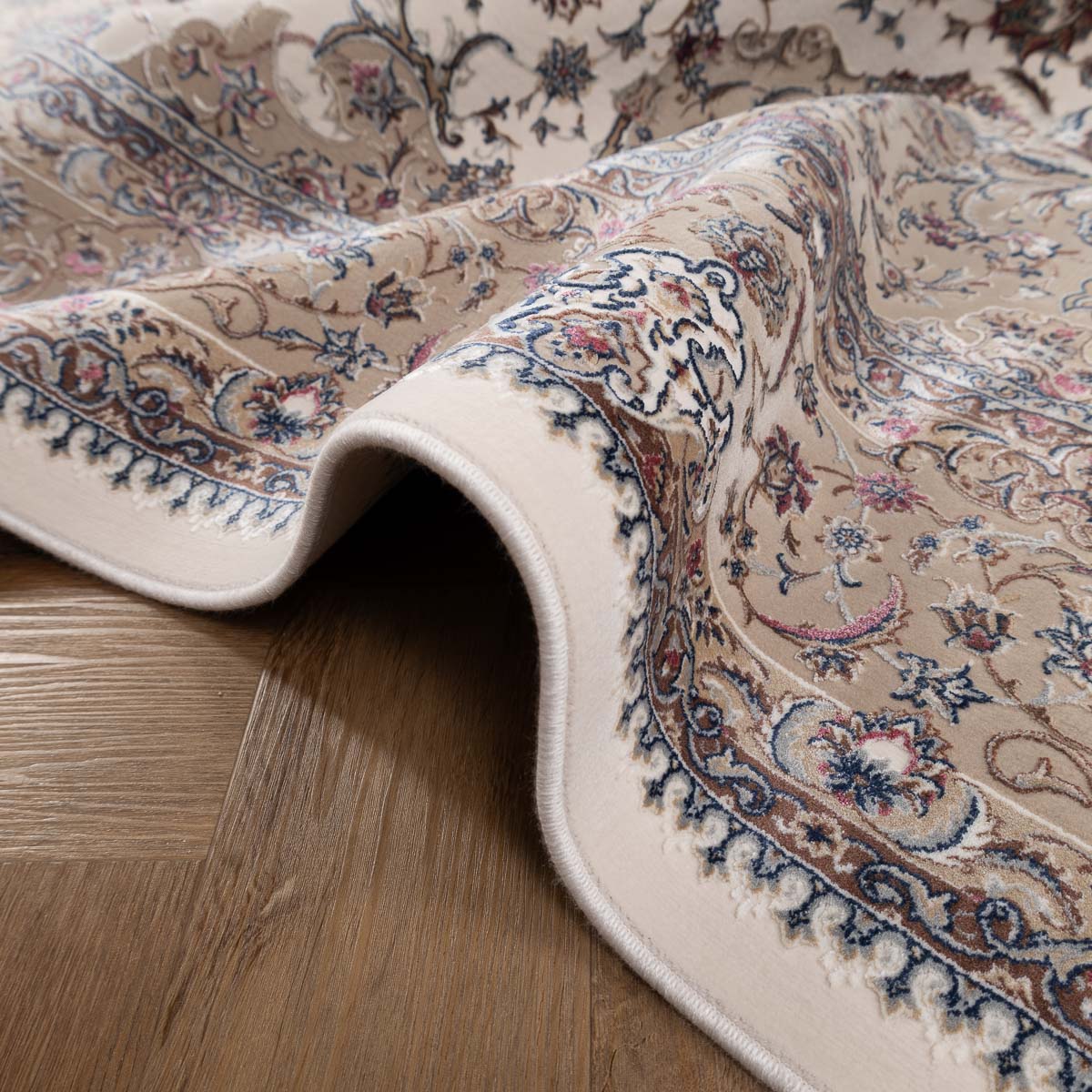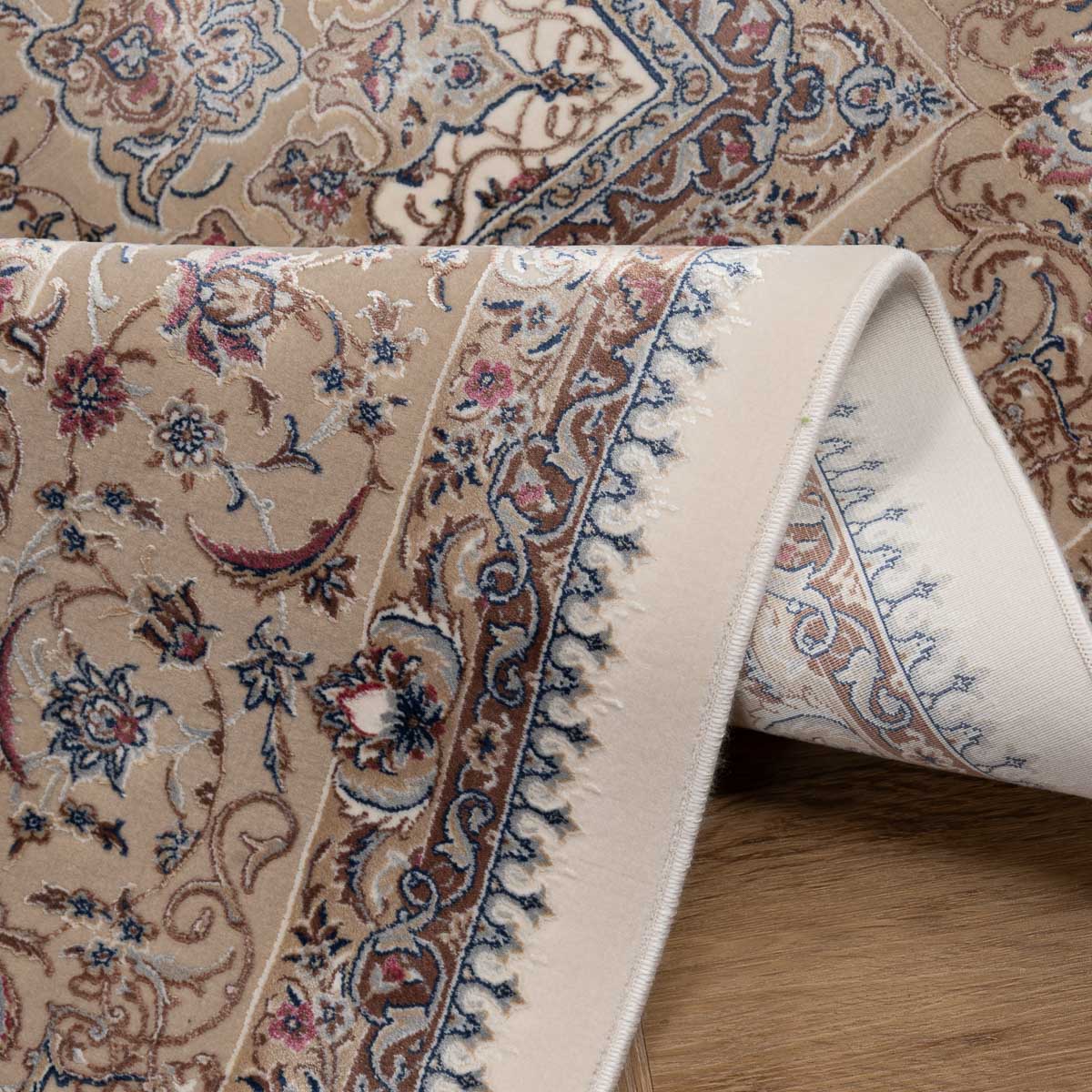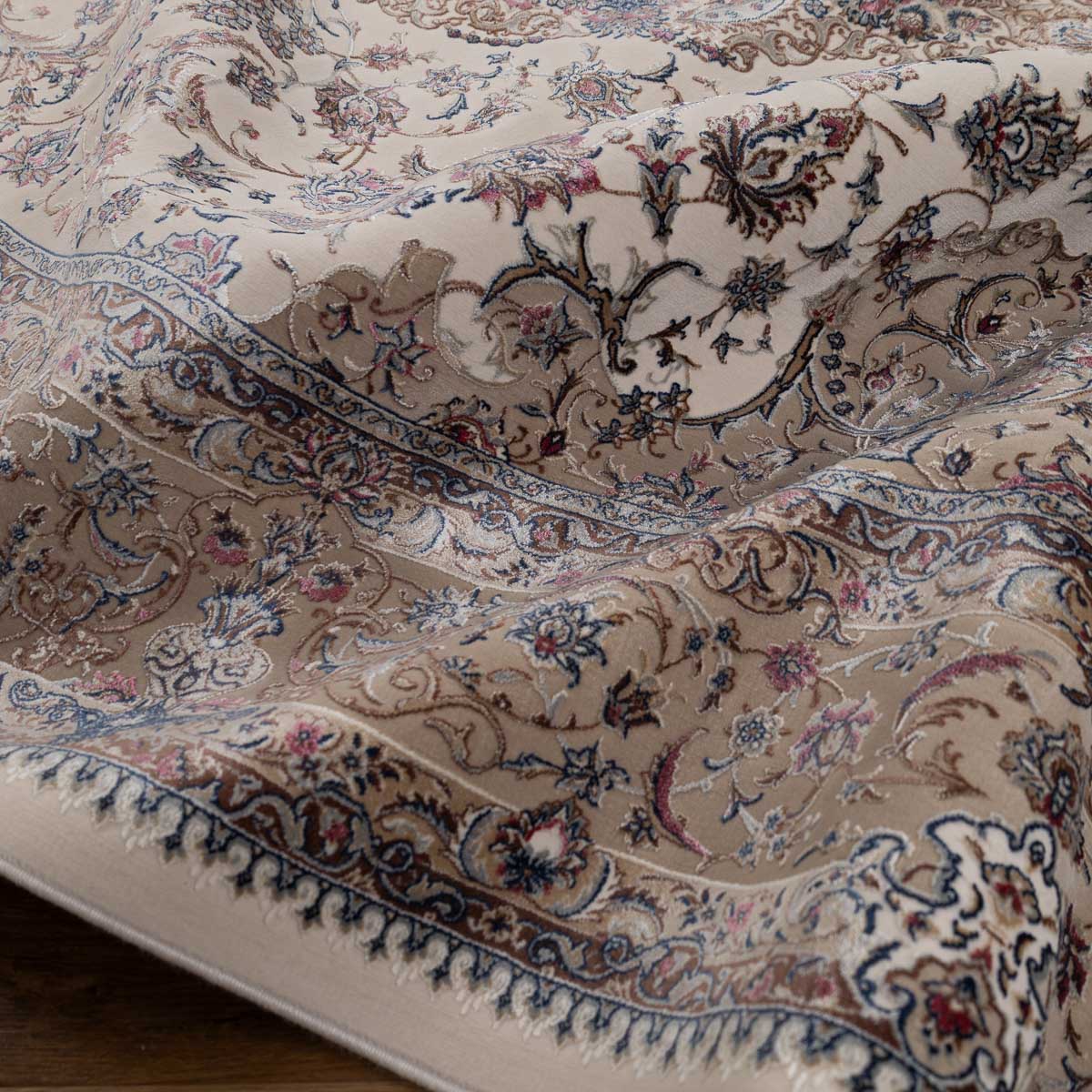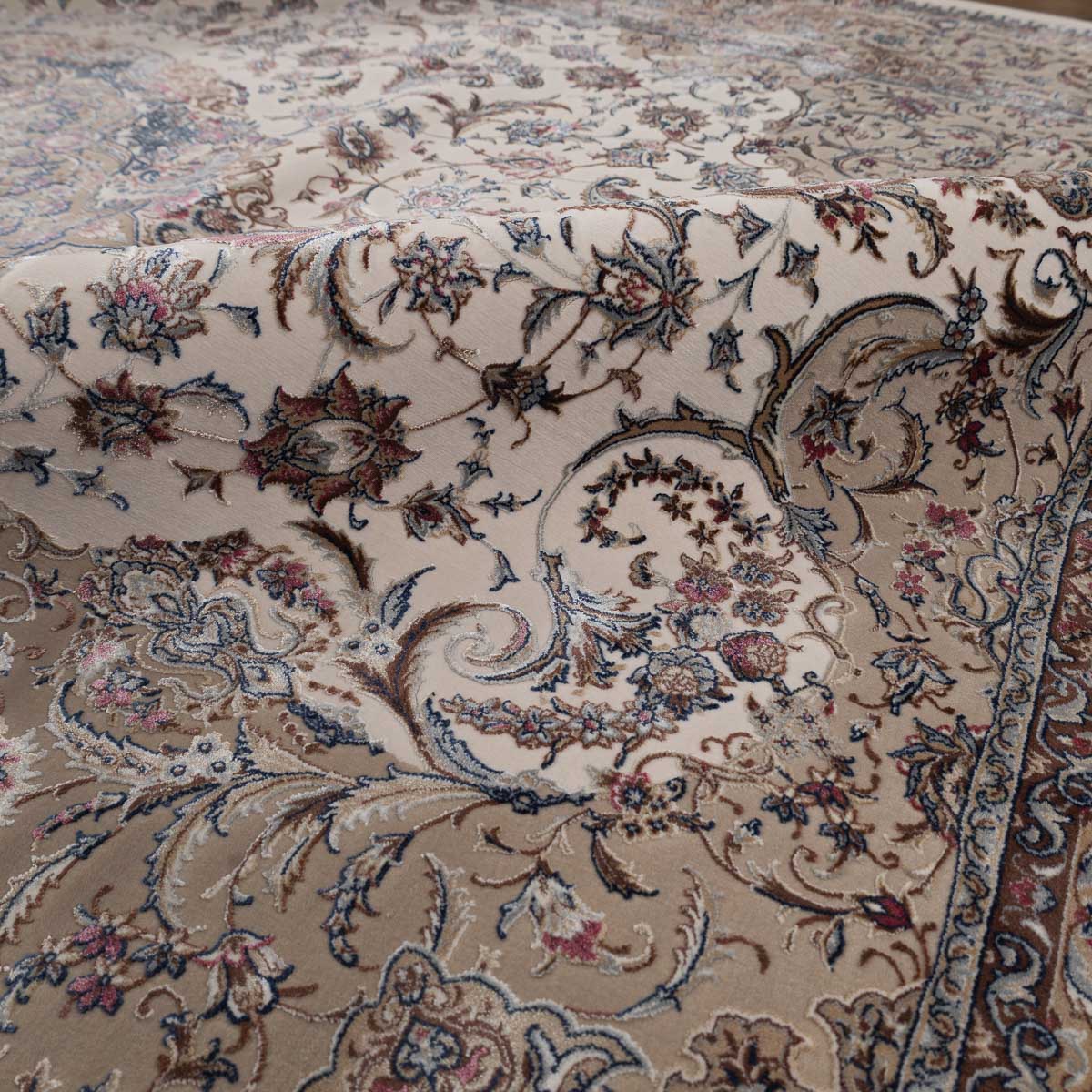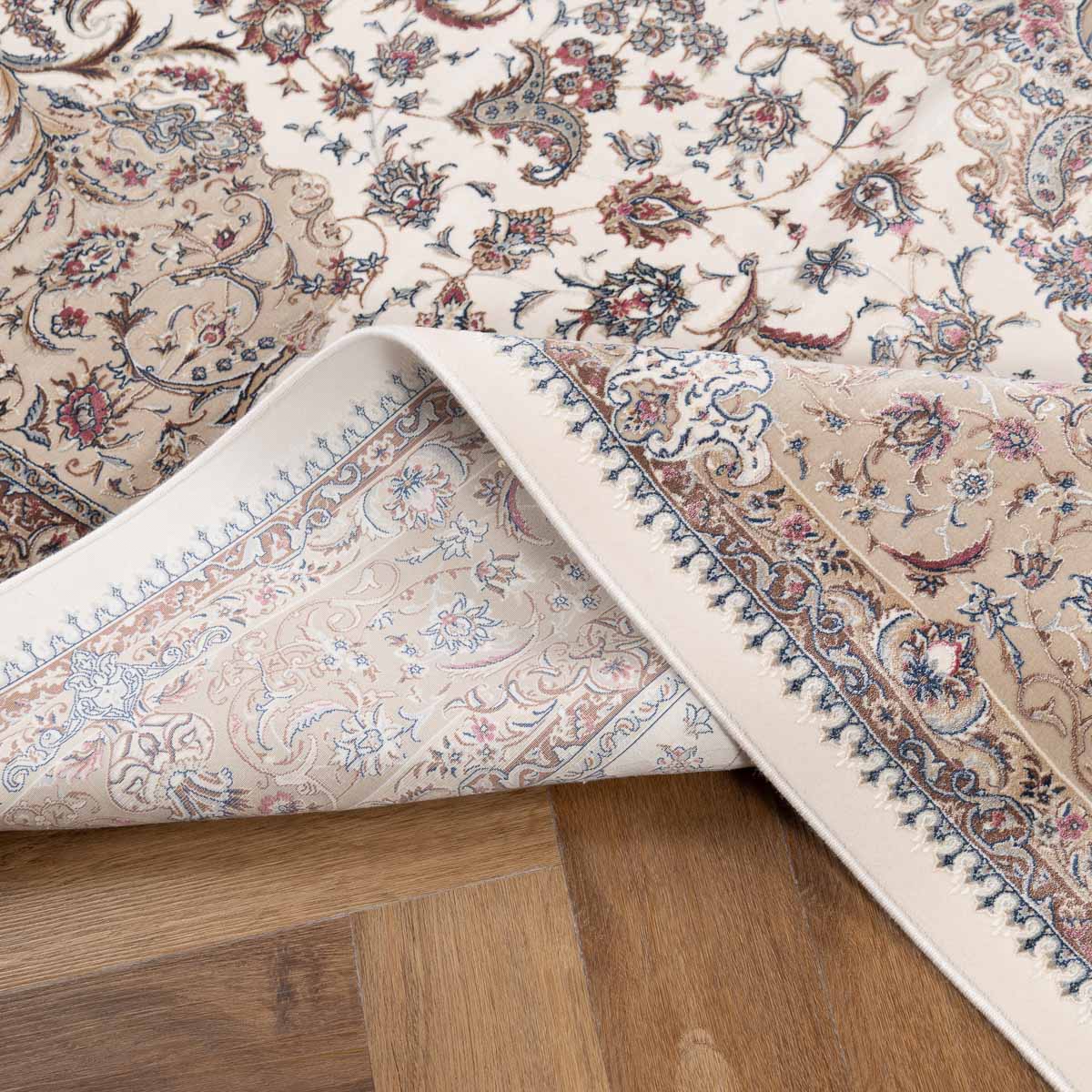 דוגמה פרסית עשירה עם מדליון מרכזי ופרטים אורנמנטליים צפופים, בפריסה סימטרית ומאוזנת. שילוב גווני בז', שמנת, חום עדין ונגיעות כחול ואדמדם יוצר מראה קלאסי, עמוק ועל זמני. מתאים לסלון מרכזי, פינת אוכל רשמית או חלל שמחפש נוכחות יוקרתית ושקטה.