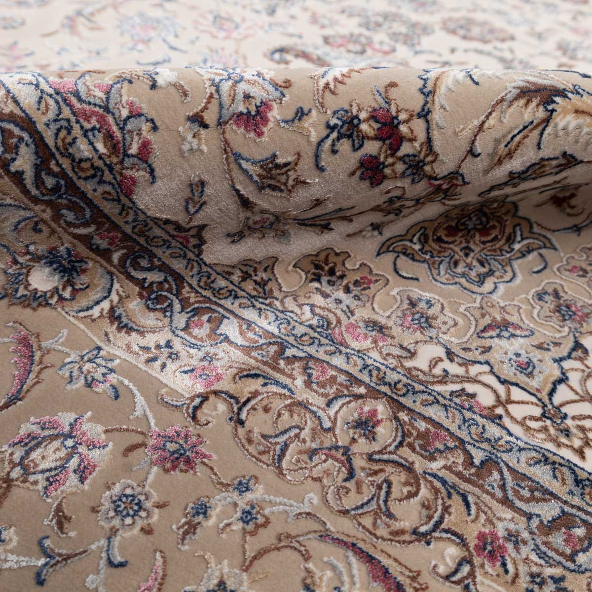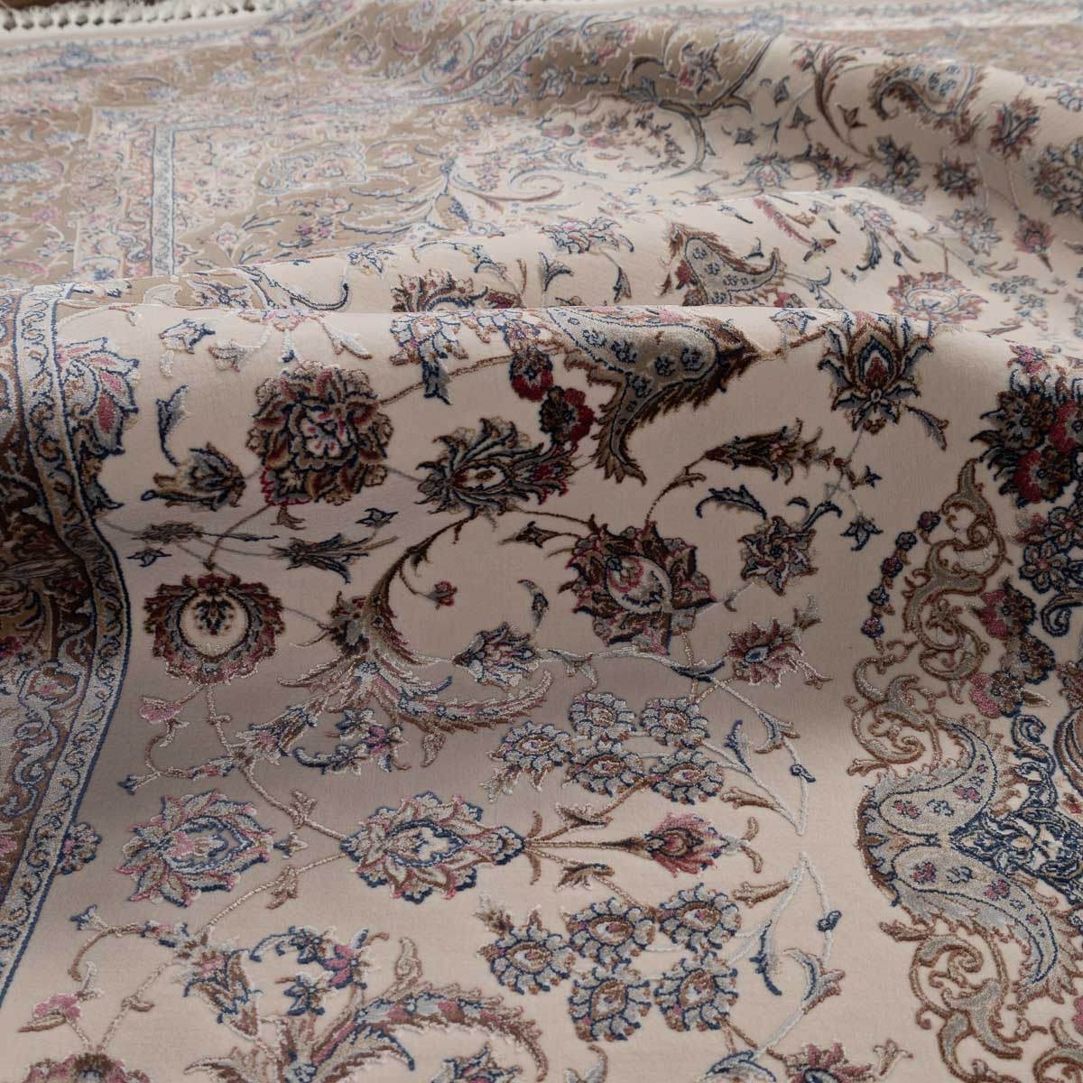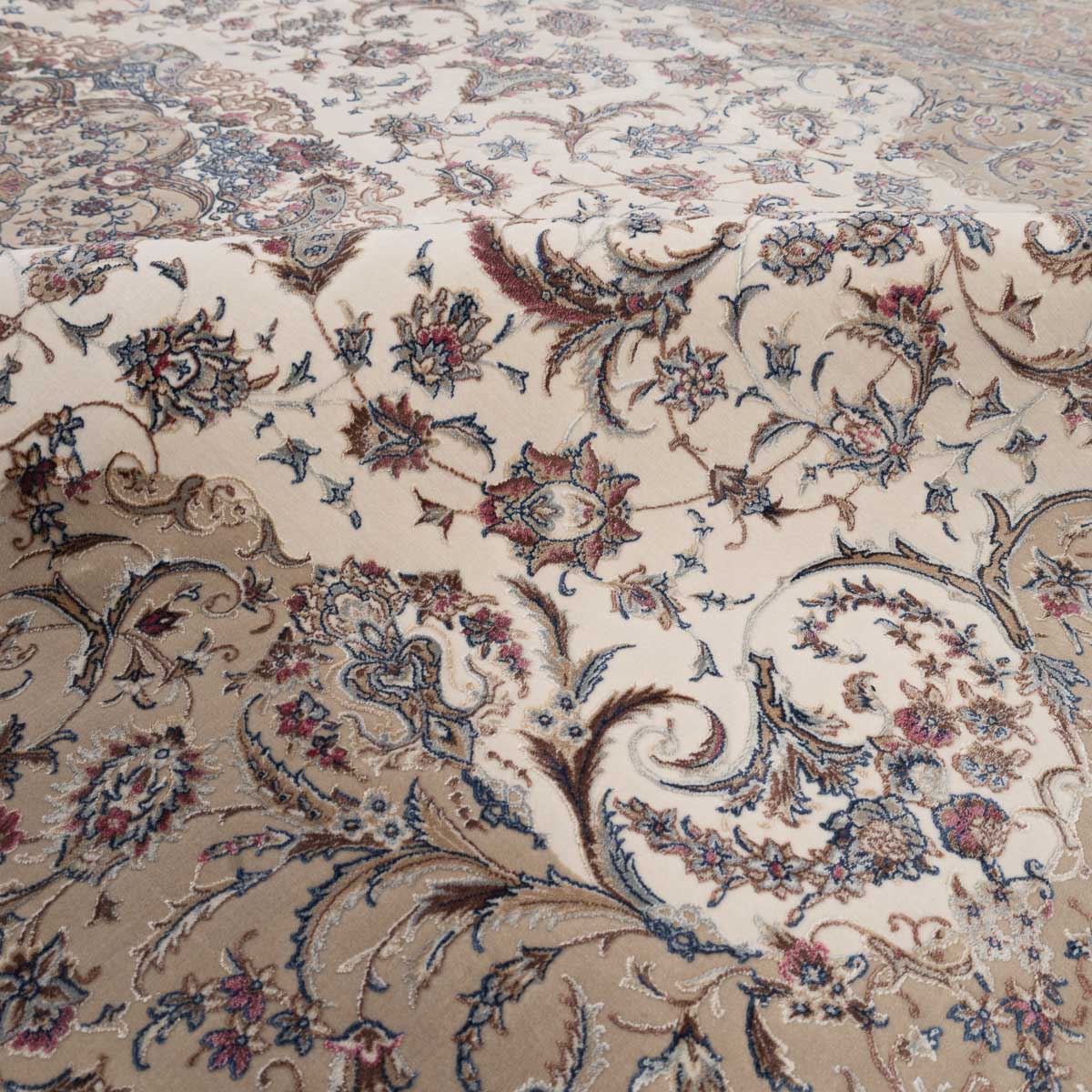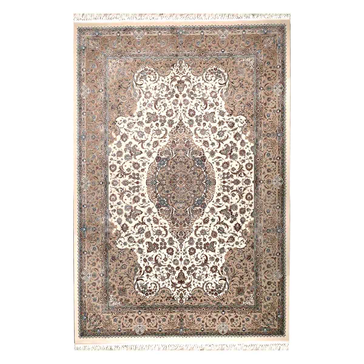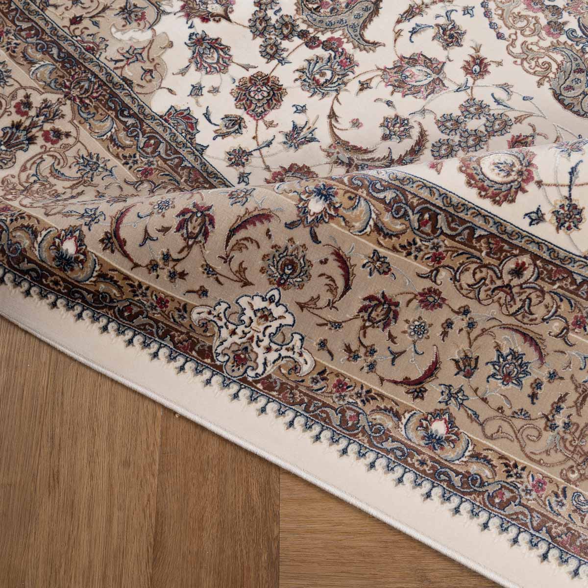 דוגמה פרסית עשירה עם מדליון מרכזי ופרטים אורנמנטליים צפופים, בפריסה סימטרית ומאוזנת. שילוב גווני בז', שמנת, חום עדין ונגיעות כחול ואדמדם יוצר מראה קלאסי, עמוק ועל זמני. מתאים לסלון מרכזי, פינת אוכל רשמית או חלל שמחפש נוכחות יוקרתית ושקטה.