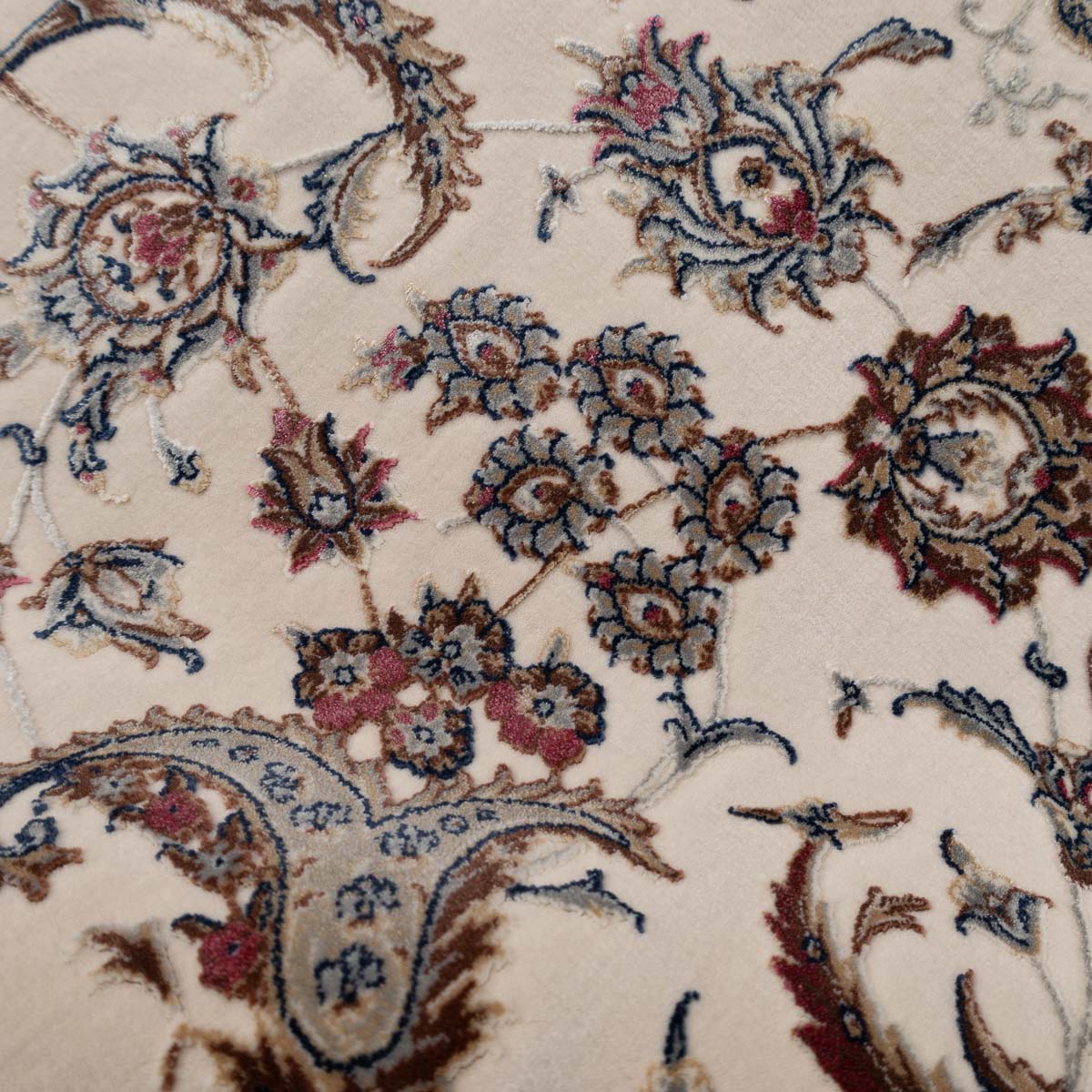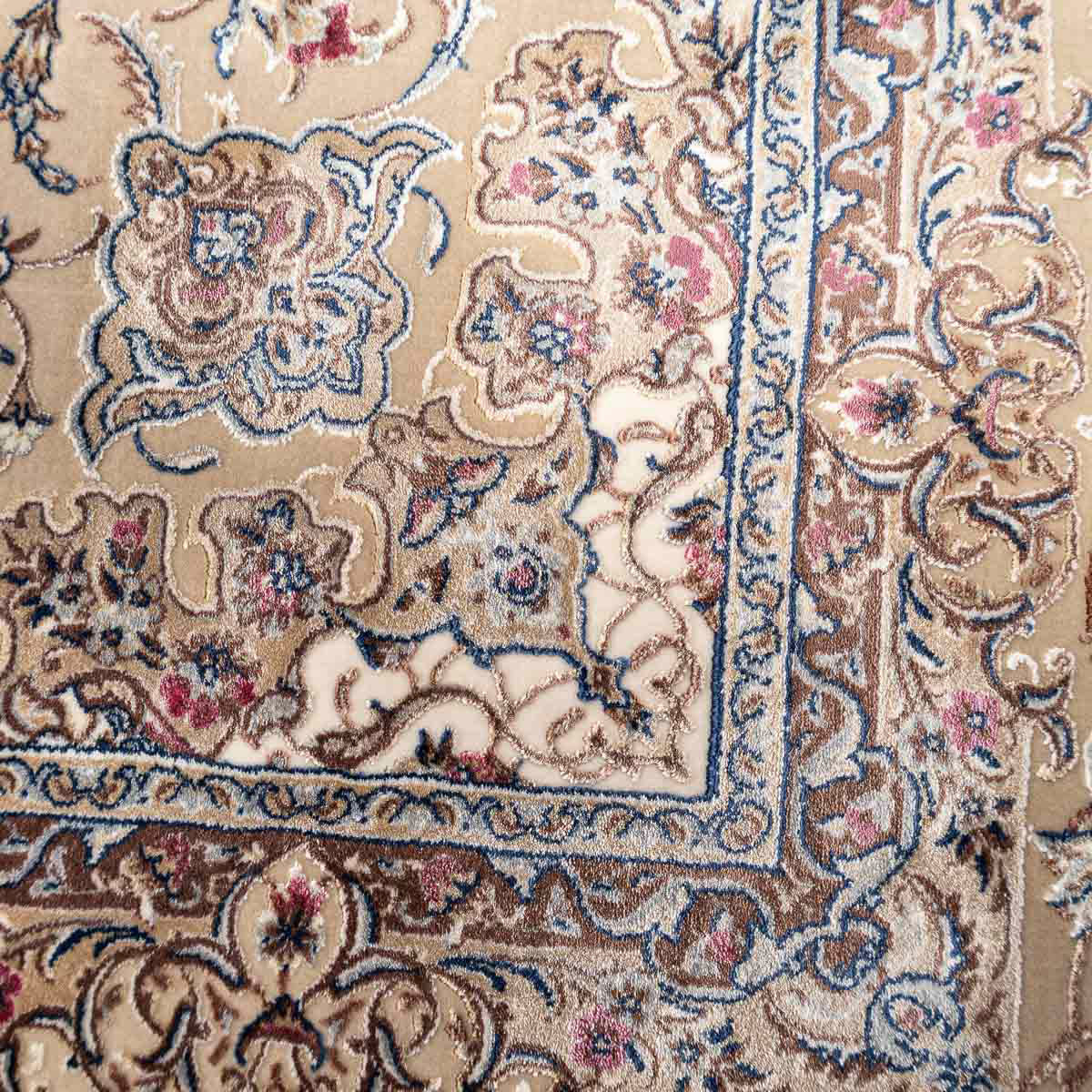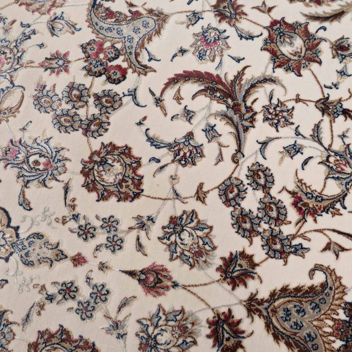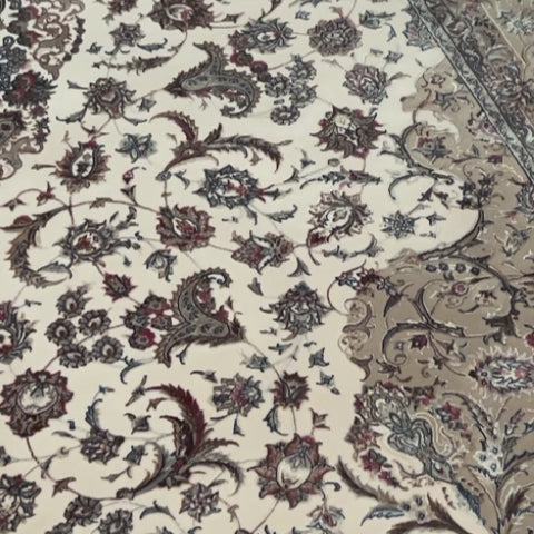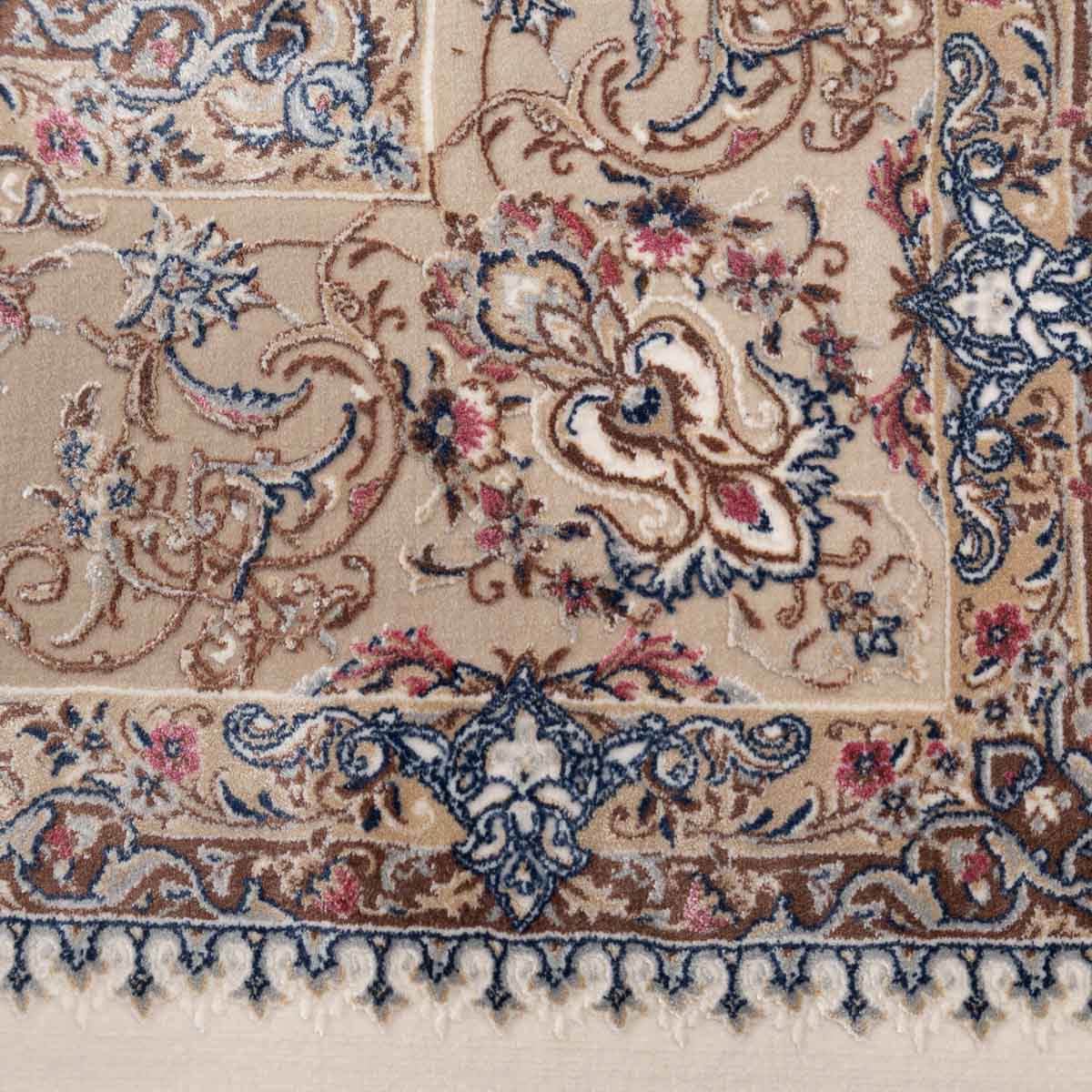 דוגמה פרסית עשירה עם מדליון מרכזי ופרטים אורנמנטליים צפופים, בפריסה סימטרית ומאוזנת. שילוב גווני בז', שמנת, חום עדין ונגיעות כחול ואדמדם יוצר מראה קלאסי, עמוק ועל זמני. מתאים לסלון מרכזי, פינת אוכל רשמית או חלל שמחפש נוכחות יוקרתית ושקטה.