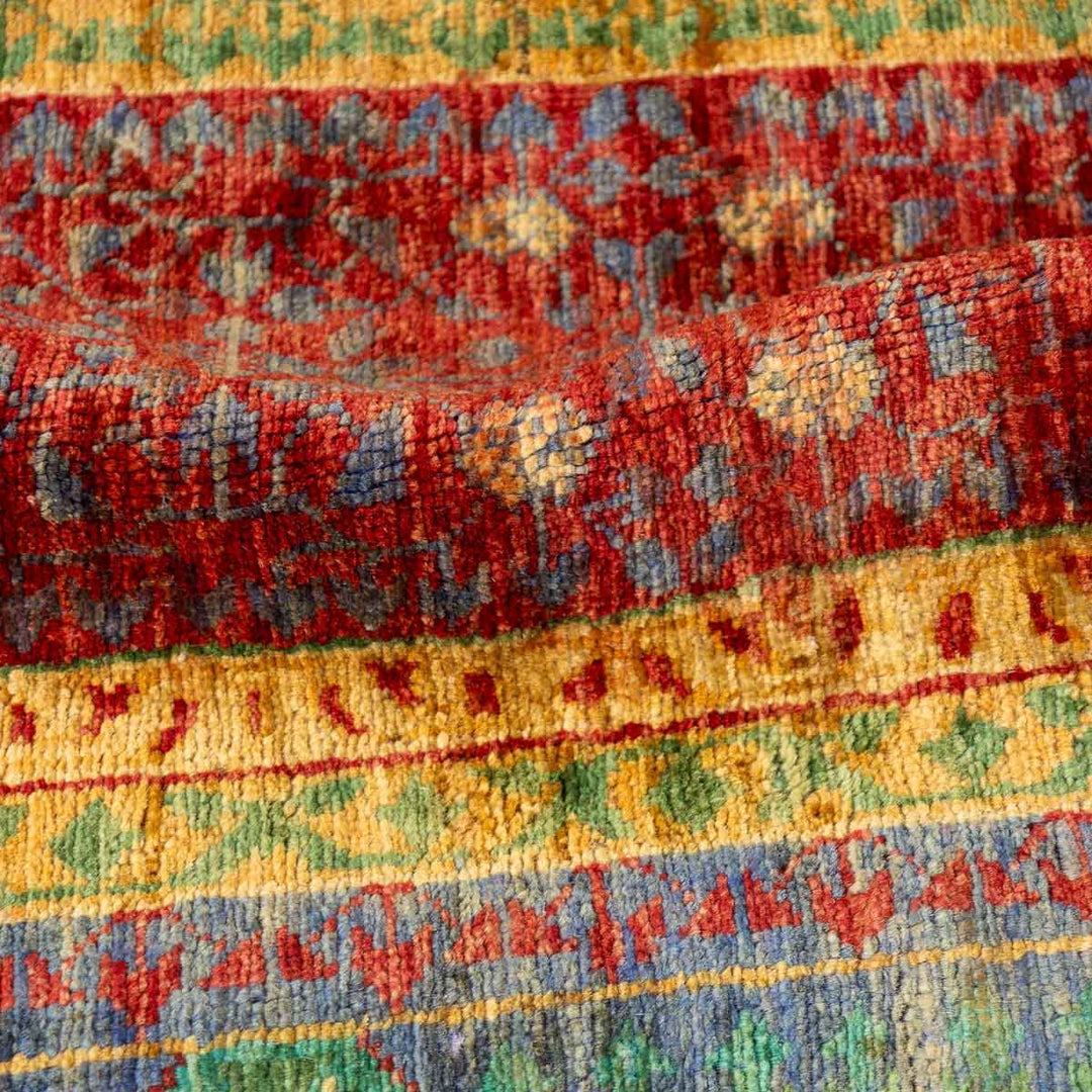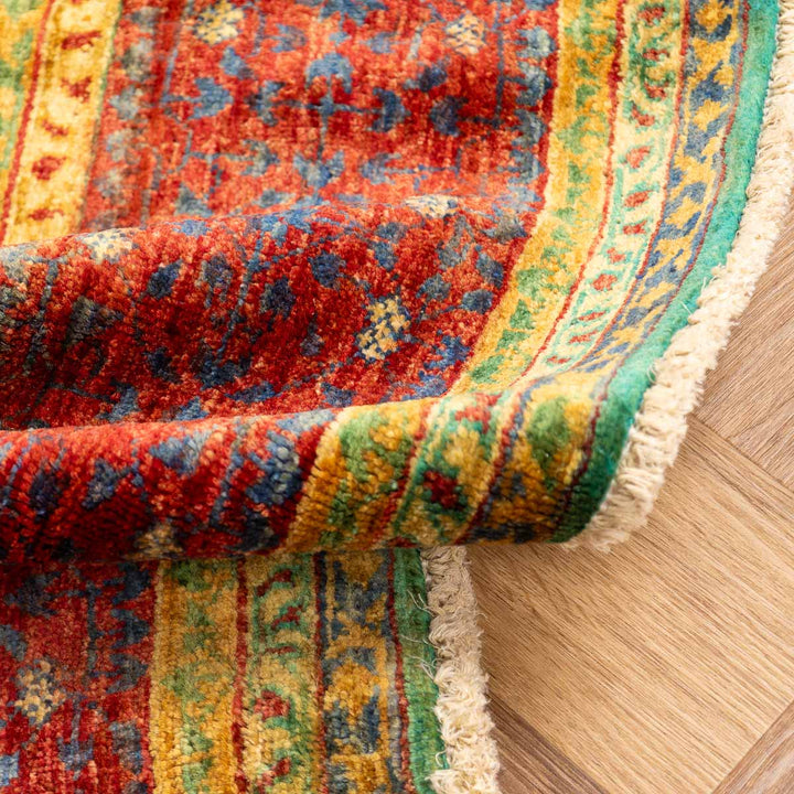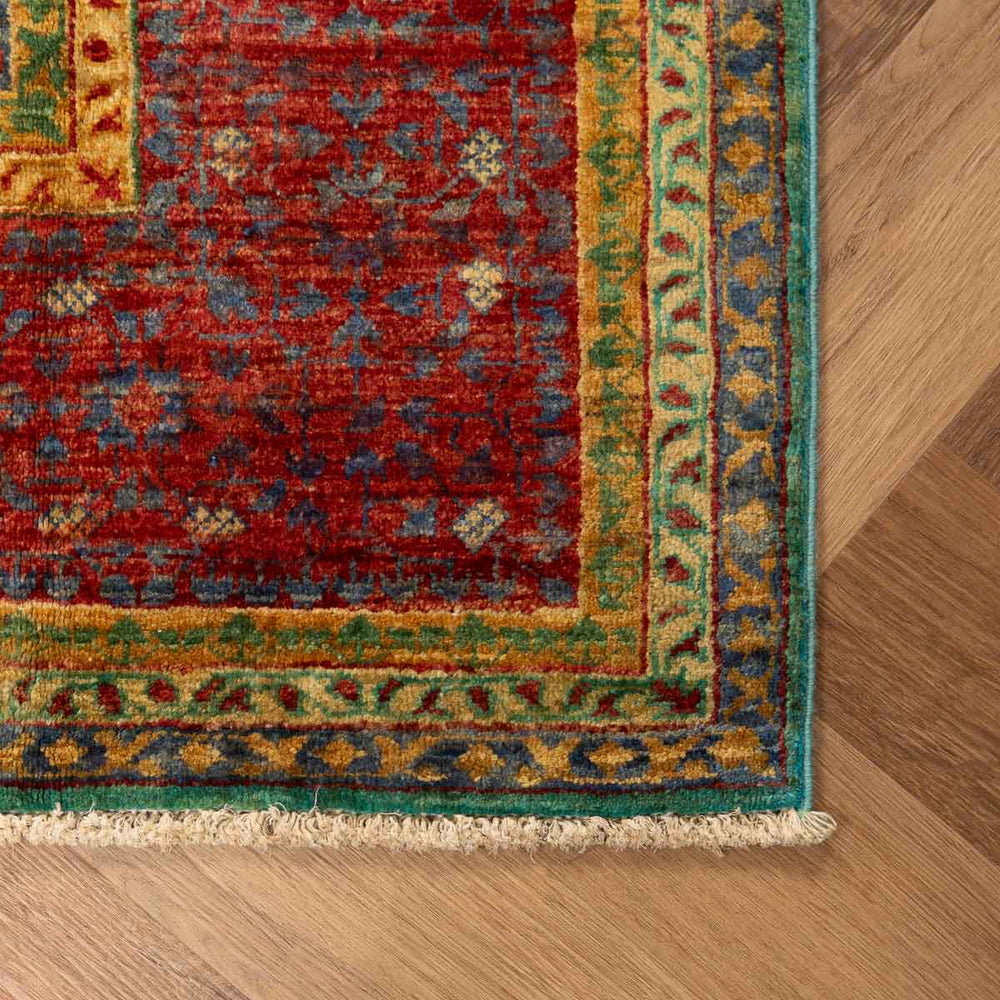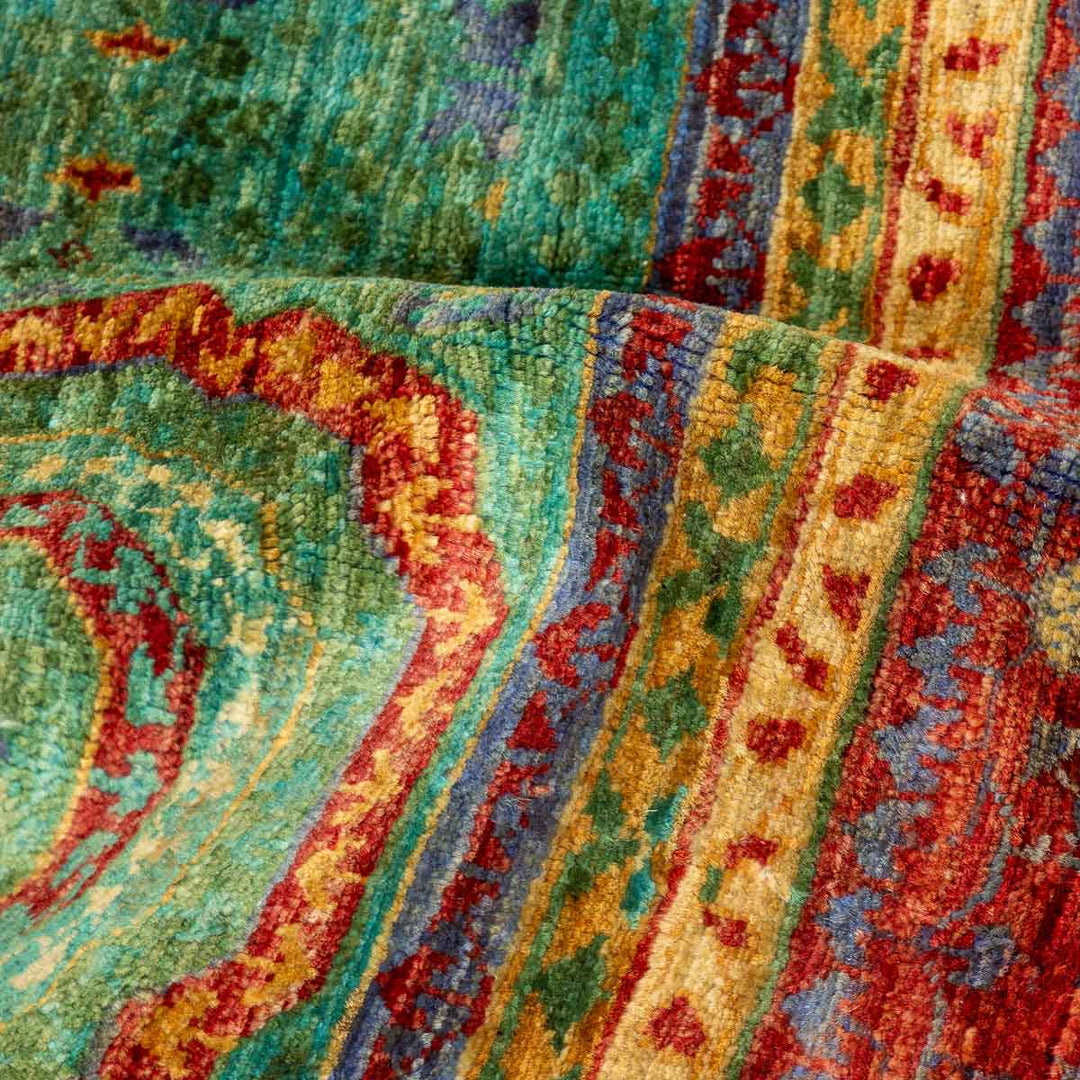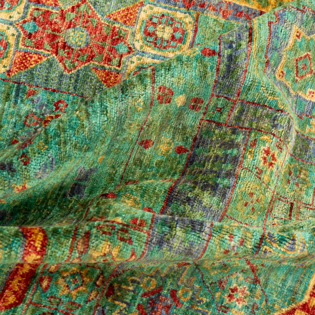 - אומנות מסורתית בסטייל מודרני: שטיח ממלוק מעוצב בעבודת יד מוקפדת, בגוונים מרהיבים של ירוק, אדום וכחול, המשלבים בין עולם העבר להווה.
