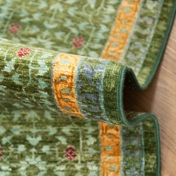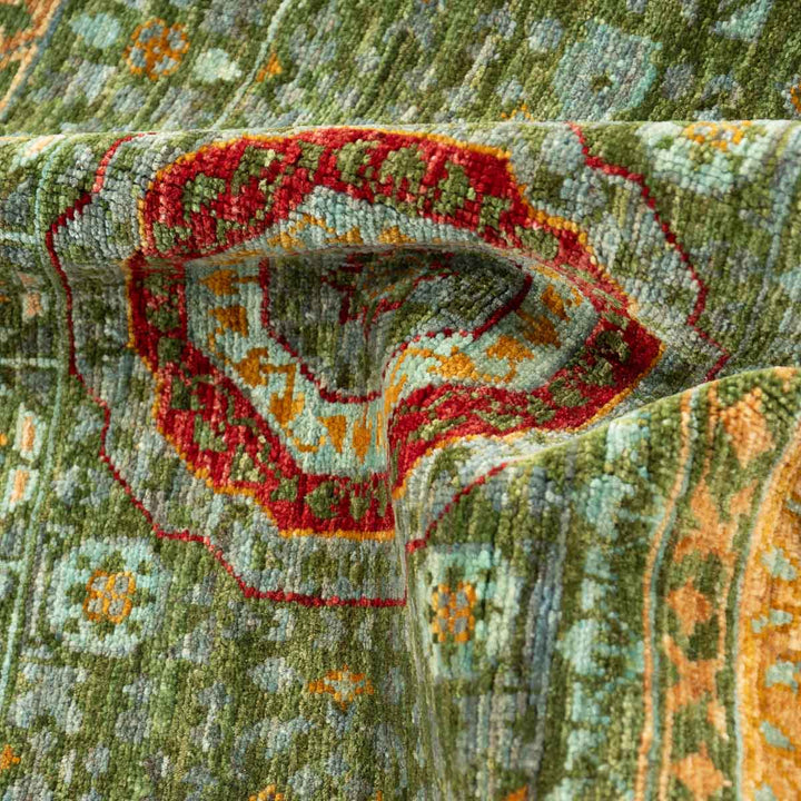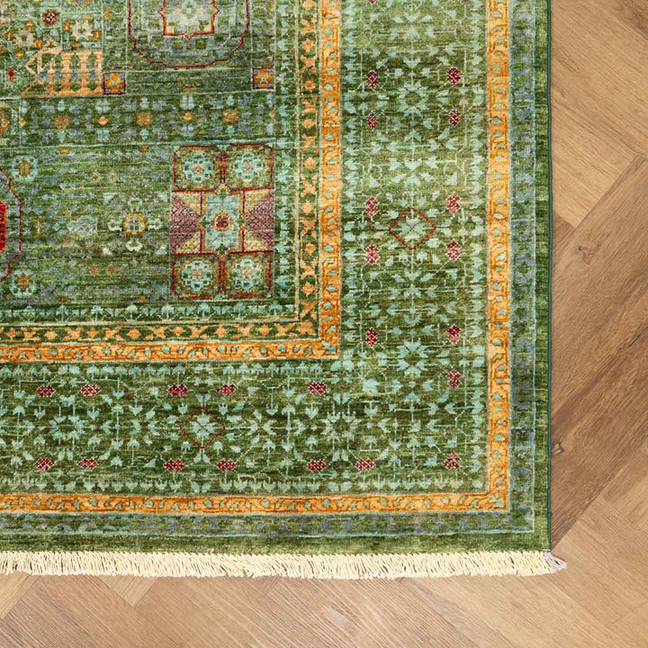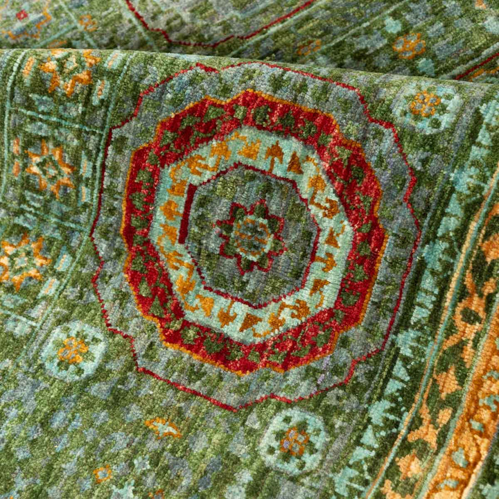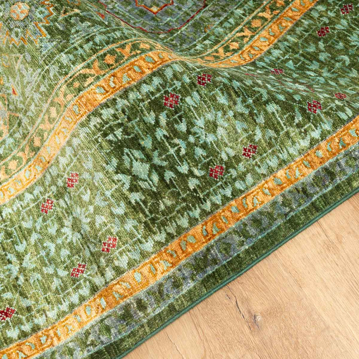 • עיצוב אותנטי: מדליון מרכזי גדול בצבע בורדו מוקף בדפוסים גאומטריים מורכבים בגווני ירוק, חרדל וזהב עתיק, עם מסגרת כפולה שמעניקה עומק והדר.