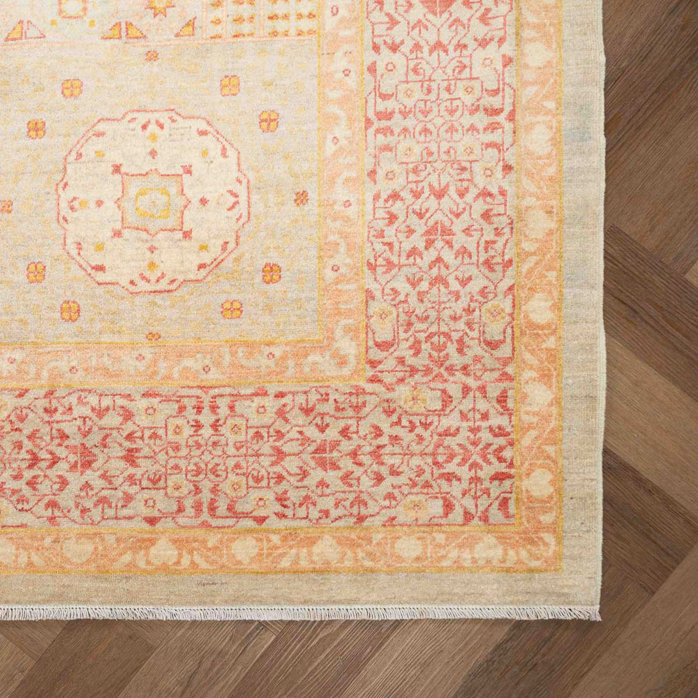 שטיח ממלוק בעבודת יד, תוצר של מלאכת אריגה מסורתית מהמזרח, השוזרת דוגמה גיאומטרית מורכבת בגוונים חמימים של זהב, ורוד וקרם. הדוגמה האופיינית של שטיחי ממלוק - עם מרכז סימטרי ופרטים מדויקים - מעניקה לשטיח מראה מלכותי וייחודי.