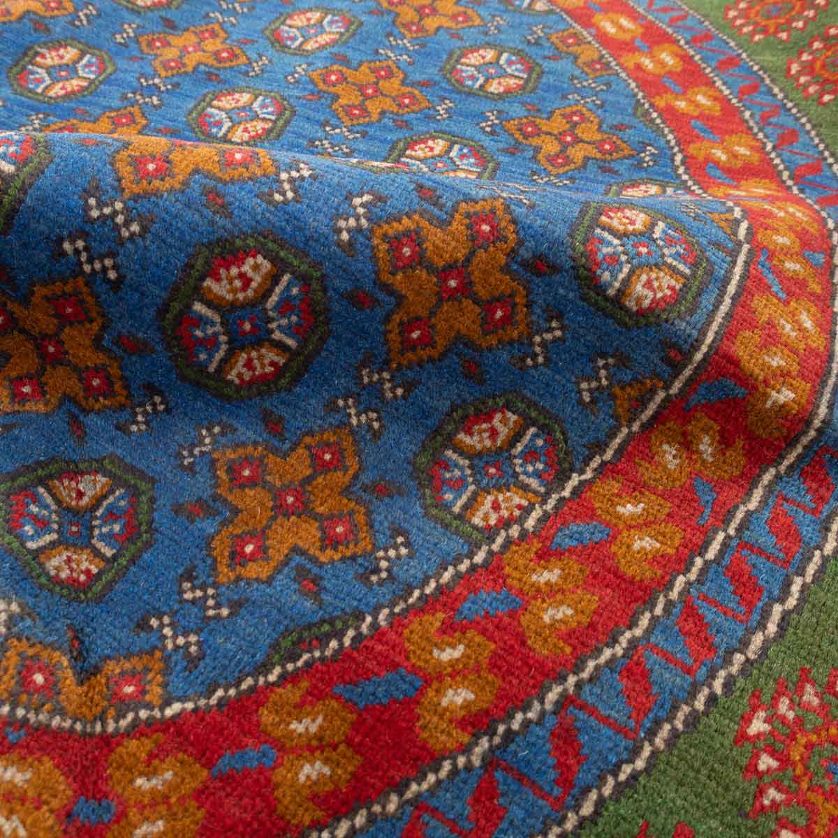 שטיח עגול ייחודי בעבודת יד בסגנון בוכרה האפגני, עם נוכחות עזה וצבעוניות מרהיבה. הרקע הכחול העמוק משובץ במדליונים גיאומטריים באדום, ירוק וזהב, כשמסגרות עבות בצבעי אדום וירוק מקיפות את השטיח ויוצרות תחושת עומק ועושר עיצובי. אידיאלי לחלל מרכזי, מתחת לשולחן עגול או כאמירה עיצובית מרהיבה בפני עצמה.