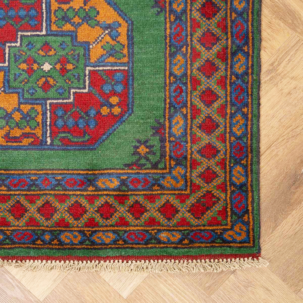 שטיח בוכרה אפגני בעבודת יד, דגם קלאסי בירוק עז בשילוב אדום וכחול עמוק. דגם זה מתאפיין בסימטריה מרשימה ובדוגמת מדליון החוזרת לאורך השטיח, המעניקה לו מראה עשיר ואלגנטי. השטיח מוסיף חמימות ותחושת יוקרה לכל חלל שבו הוא מונח.